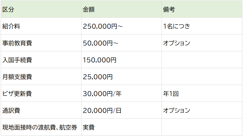 料金は特定技能人材1名あたり、下記は税抜・目安額です。